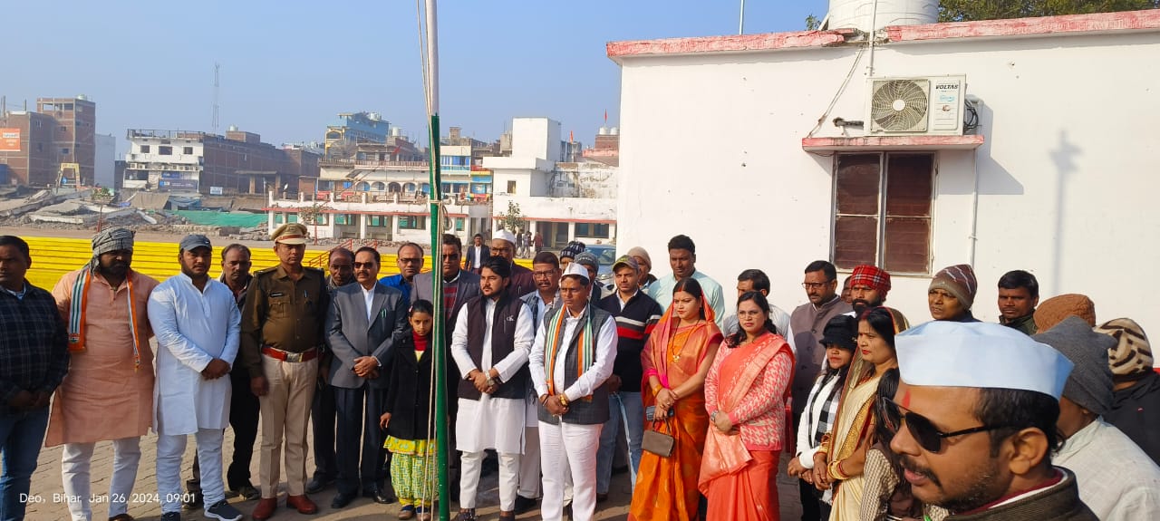 देव प्रखंड क्षेत्र में 75 वां गणतंत्र दिवस शुक्रवार को धूमधाम से मनाया गया.सबसे पहले प्रखंड कार्यालय पर झंडोतोलन प्रमुख मानमती देवी ने की.देव थाना में थानाध्यक्ष राजगृह प्रसाद,ढिबरा थाना में थानाध्यक्ष पवन कुमार,देव CHC में अस्पताल में डॉ मोहमद समीद, बनुआ पंचायत भवन में मुखिया पूजा चौधरी, एरौरा पंचायत भवन में मुखिया निरंजन साव,दुलारे पंचायत भवन में मुखिया बिजेन्द्र कुमार,देव नगर पंचायत कार्यालय पर नगर अध्यक्ष पिन्टू साहिल सहित अन्य जगहों पर शान से तिरंगा लहराया गया.मौके पर बीडीओ कुन्दन कुमार,सीओ आशुतोष कुमार उपाध्यक्ष गोलू गुप्ता सहित अन्य लोग मौजूद थे.