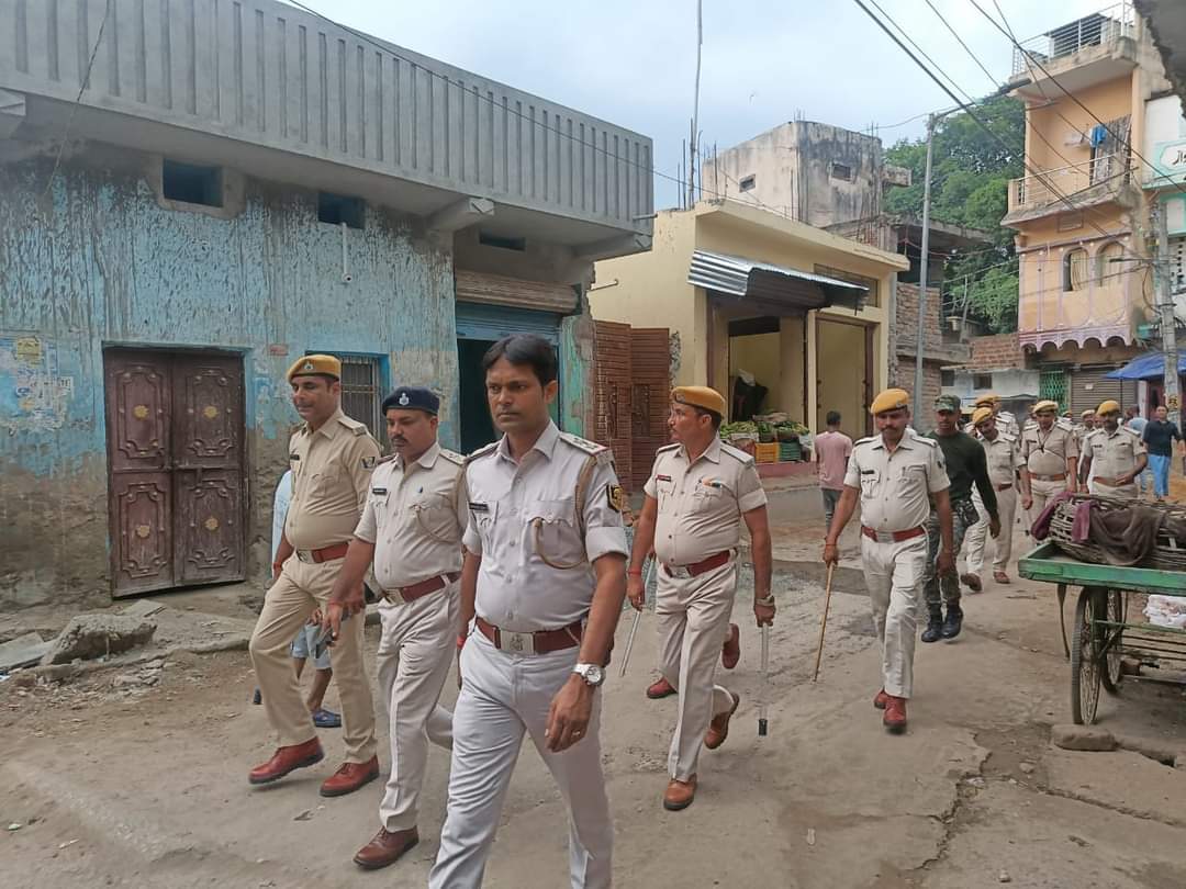 फ्लैग मार्च के दौरान नगर थानाध्यक्ष पंकज कुमार सैनी साथ ने पुलिस जवान चितरंजन कुमार:- जन्माष्ठमी और चेहल्लुम पर्व के…