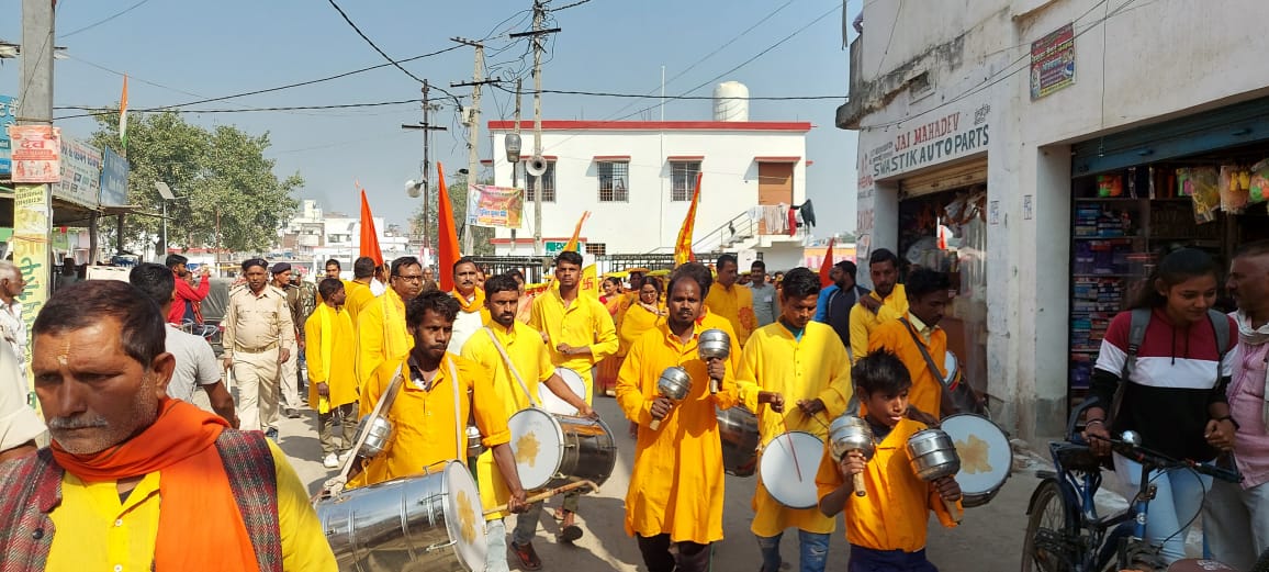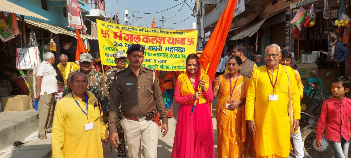 ध्वज लहरा कर कलश शोभा यात्रा प्रारम्भ किया गया यह कलश यात्रा सूर्य कुण्ड तालाब परिसर से प्रारम्भ होकर देव गोदाम नया बाजार मुख्य बाजार सड़क पर अस्पताल रोड़ थाना मोड़ सीआरपी कैप बरई बीघा चौरसिया नगर होते हुए पुनः यज्ञ स्थल पहुंच कर कलश आरती के साथ स्थापित किया गया।