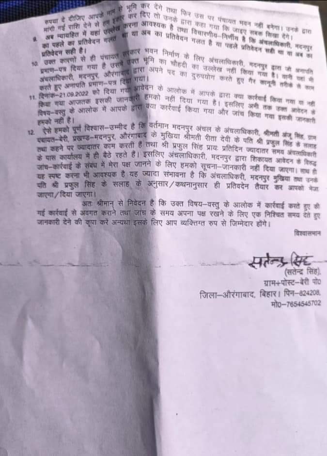 दरअसल मामला बिहार के औरंगाबाद जिले के मदनपुर प्रखंड के ग्राम पंचायत बेरी का है। खुलासा करते हुए प्रमोद सिंह ने बताया है कि पंचायत सरकार भवन के जमीन के दाखिल खारिज में भ्रष्टाचार साफ दिखाई देता है। एक ही जमीन के दाखिल खारिज के आवेदन को जहां पूर्व में अंचल अधिकारी के द्वारा अस्वीकार किया जाता है, वही दोबारा वर्तमान मुखिया प्रतिनिधि के द्वारा पैसे खा कर उसी आवेदन को स्वीकार कर लिया जाता है एवं एनओसी दे दी जाती है।वहीं दूसरी तरफ आम नागरिक के निजी जमीन के दाखिल खारिज के लिए लाल मुर्गे का मांग किया जाता है। उदाहरण हैं बेरी गांव के ही सत्येंद्र कुमार सिंह जिनके जमीन के दाखिल खारिज के लिए लाल मुर्गा यानी ₹1,00,000 का डिमांड अंचल अधिकारी के द्वारा किया गया। जिसकी सूचना लिखित में सत्येंद्र कुमार सिंह ने जिला पदाधिकारी महोदय को भी दिया है।